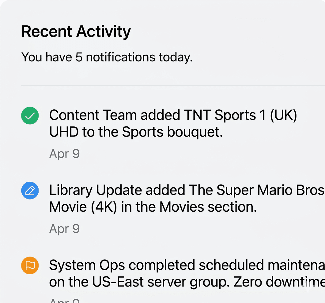 Get real-time notifications on channel additions, new VOD releases, and critical service updates. Your content library is always fresh.