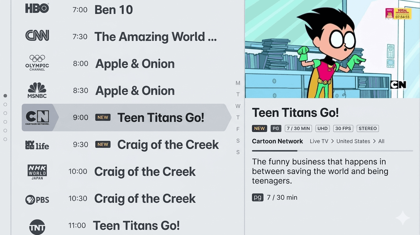 Organized, searchable, and always updated. Find your favorite show in seconds among 24,000+ channels.